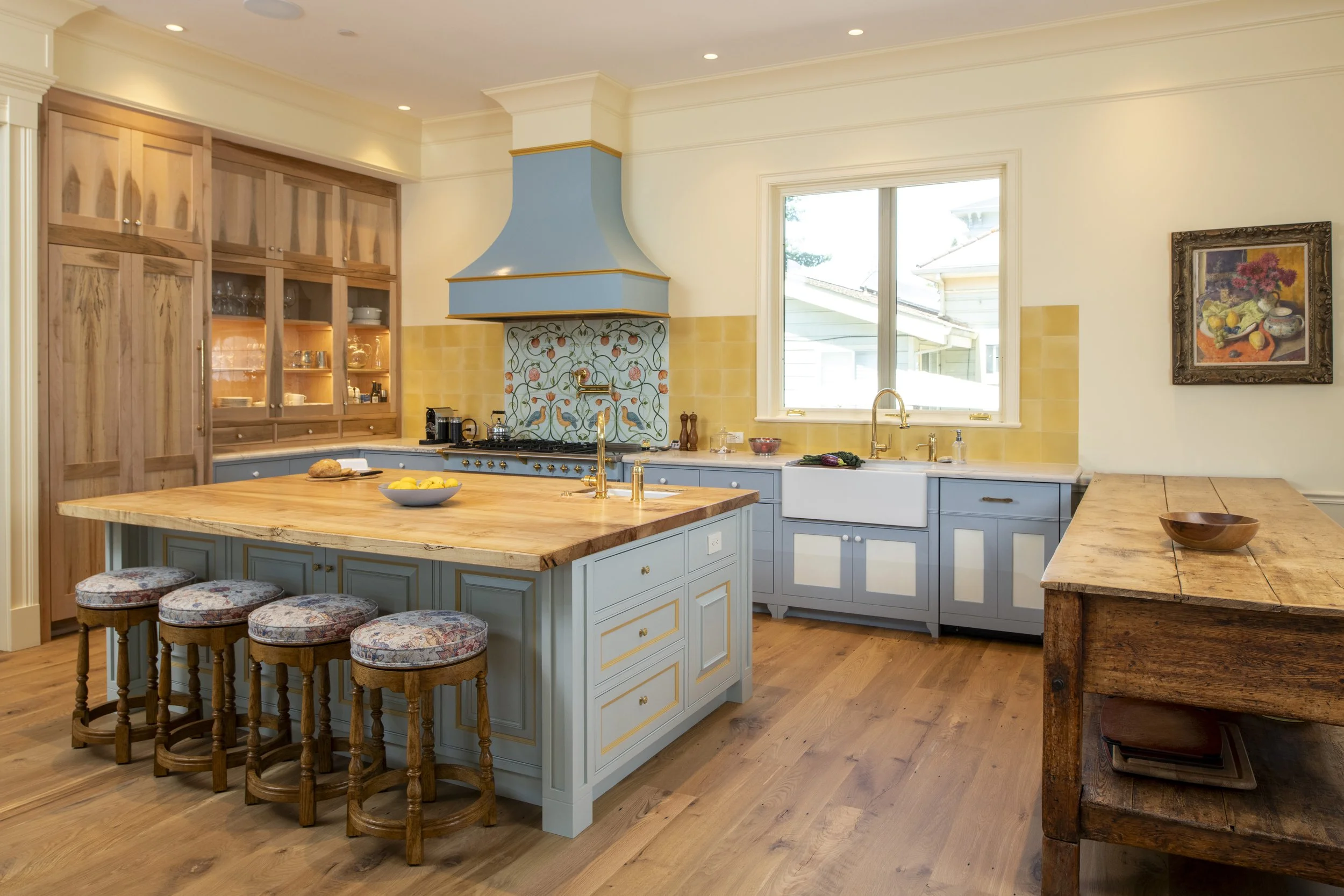 The custom tile painter, someone we have worked with for over two decades, transformed Marie’s painted rendering into a unique stove backsplash.