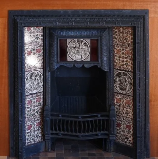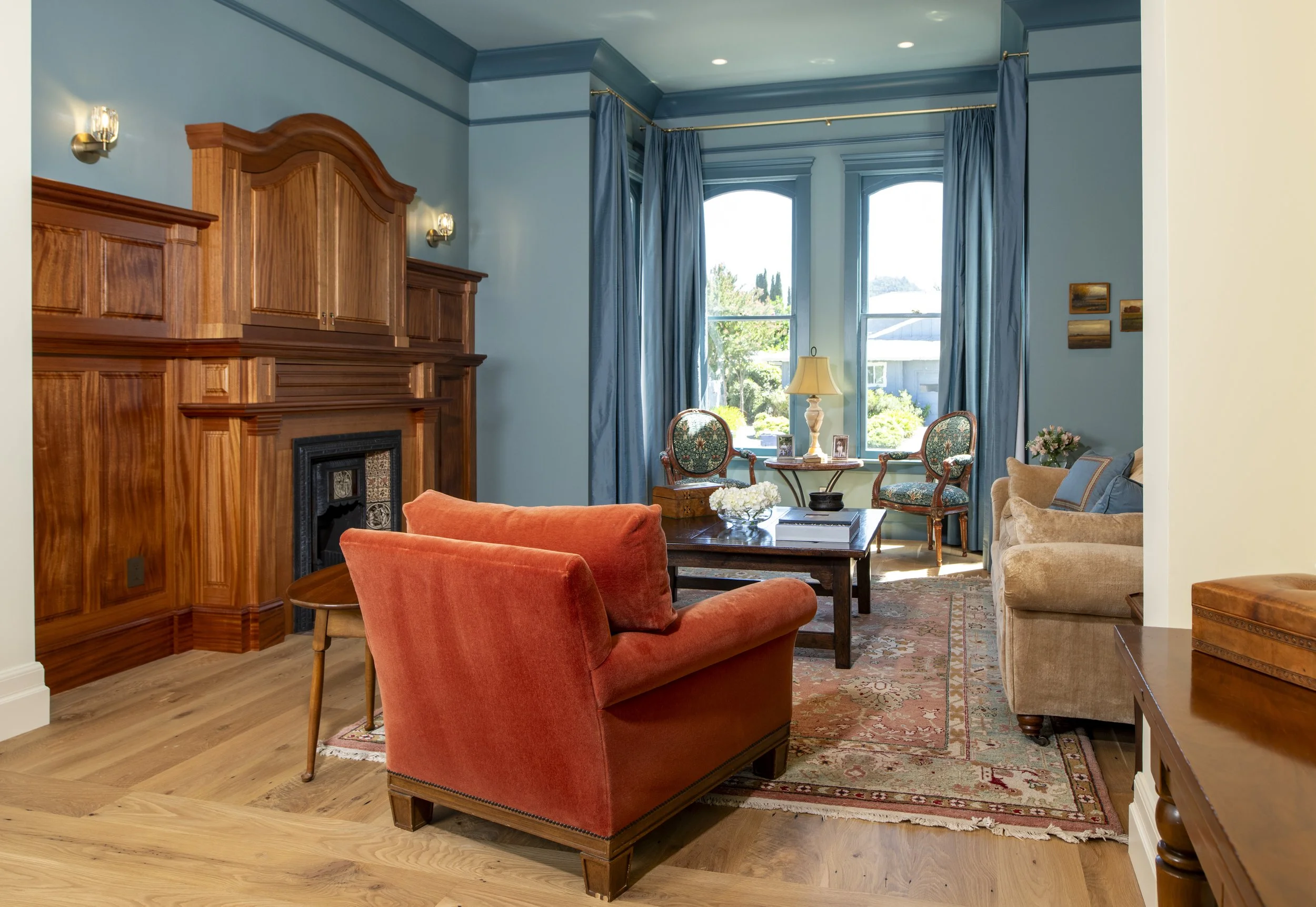 There are too many individual furnishing elements to write about, but one worth recounting illustrates the deliberation required for such a project. We sourced a Victorian cast-iron tiled fireplace insert that had recently been salvaged from a central London townhouse and restored to its former glory. The fireplace included the original eleven hand-painted ceramic art tiles with characters from Sir Thomas Malory's epic "Le Morte d'Arthur" designed by the famous ceramic artist and designer John Moyr Smith. In its new California sitting room, the fireplace is centered on a custom mahogany paneled wall.