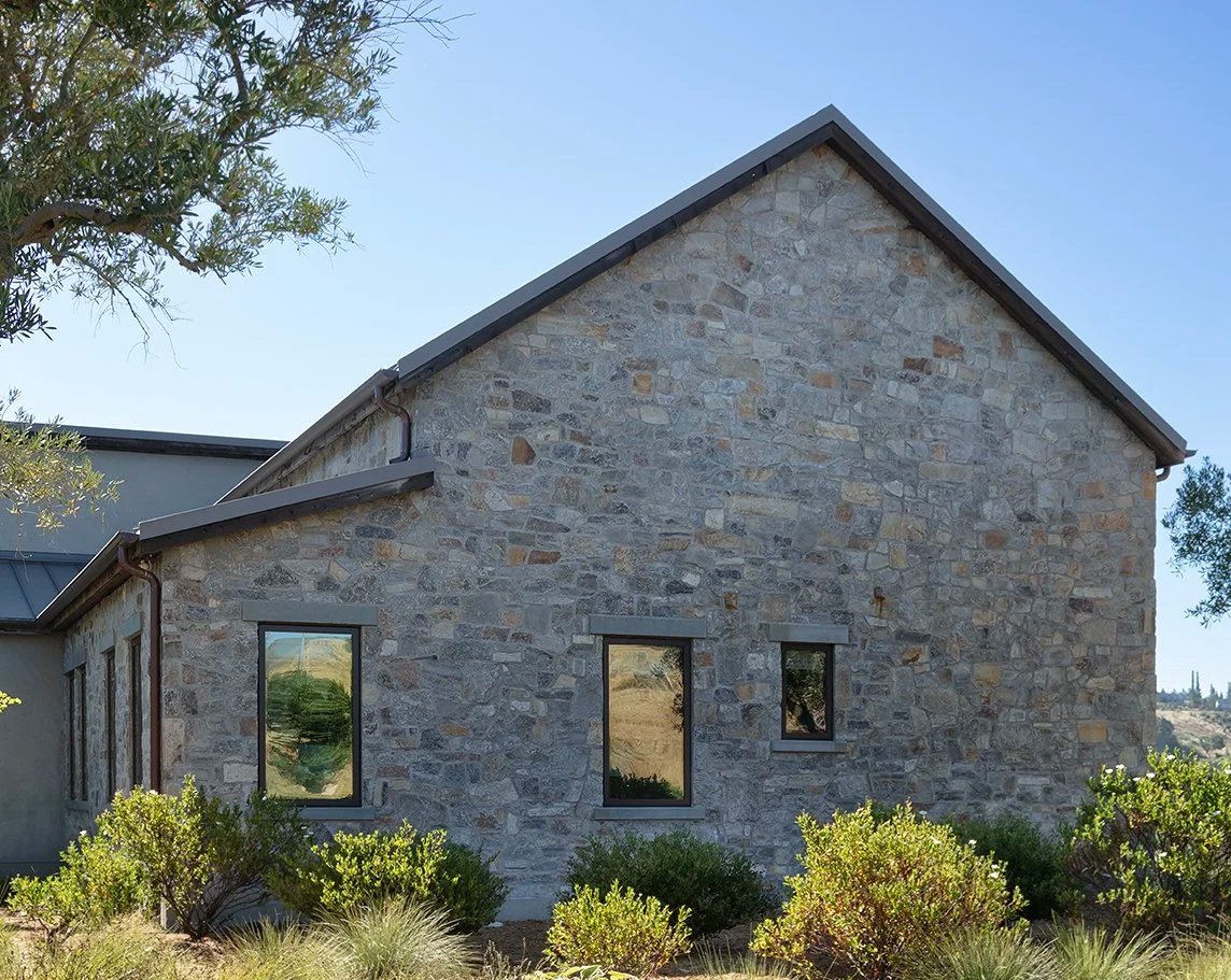 We discovered that the Buena Vista Winery was built with a stone called Tufa, so we began a search for a comparable material. Our building walls were constructed with Insulated Concrete Forms (ICFs). We were looking for a quarry that could provide a 3” thick stone cladding with sizes up to 30” x 22”. Typical stone cladding has a maximum height of 14”. Tufa was not available, yet we were determined to match the range of colors and textures found in Tufa. After a 3-month search during which we rejected many samples, found a quarry that could meet our specifications.