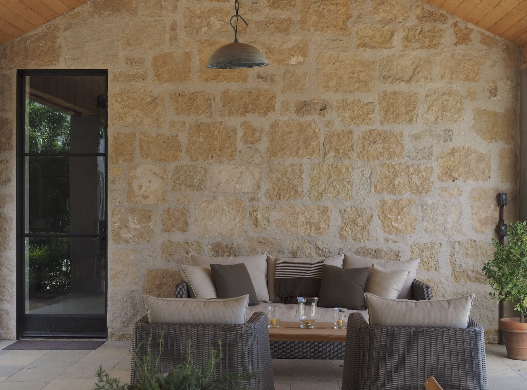 Once the material arrived, the masonry contractor erected an 8-foot-high L-shaped concrete block wall to experiment with stone patterns, grout width, and corner details. It took multiple attempts to establish the look we were trying to achieve. Next, we had to determine the grout material, ingredients, and color by getting the sand mix and organic matter perfectly balanced. And after many experimental formulations, we were ready to go.