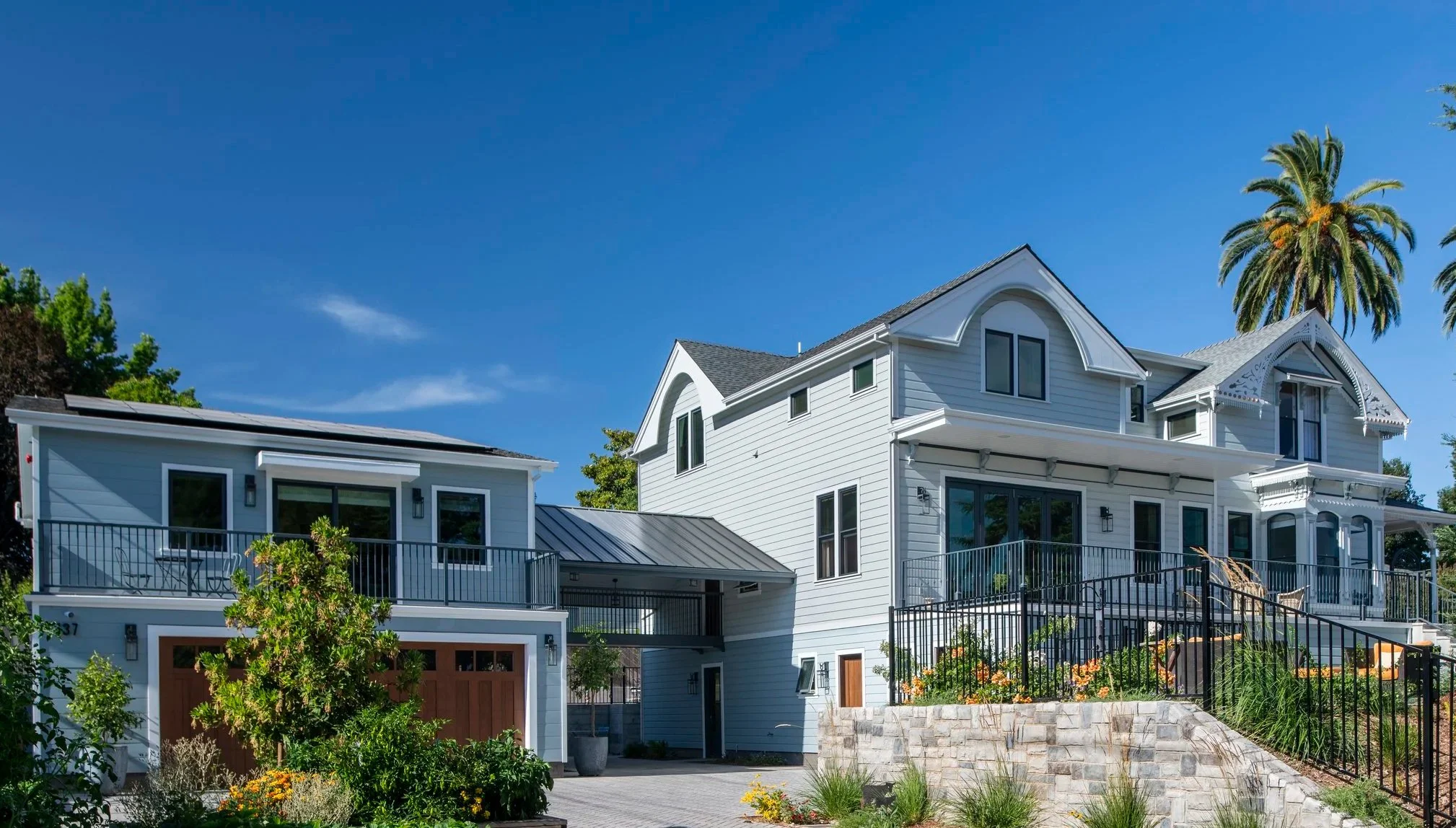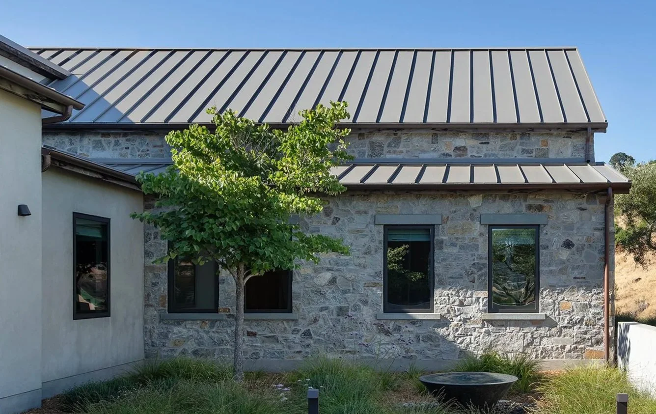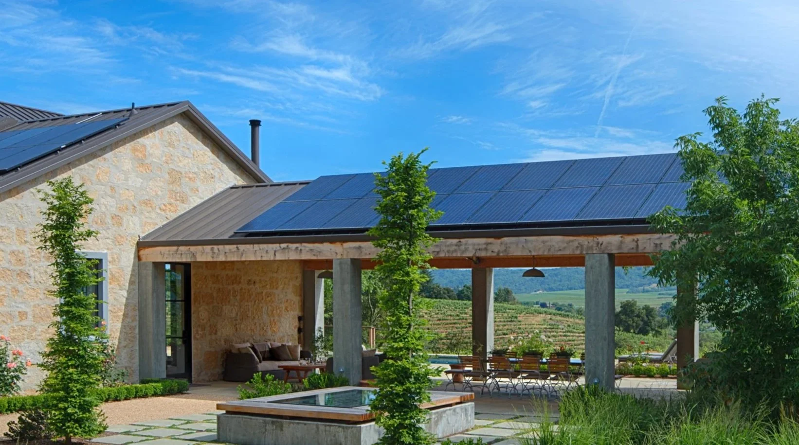 This home is built with ICF construction (insulated concrete forms). The windows are custom-made in steel by Architectural Ironworks. There is no wood framing on any of the exterior stone-clad walls. The inherent efficiency of the building envelope, along with the solar panels, makes this home very energy-efficient.
